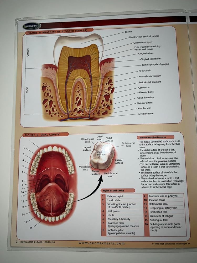 This 4-page laminated quick reference Guide is the ultimate reference for the structure of the mouth, Dental: Upper and Lower. This Guide provides an effective summary of the physiological structure of the upper and lower teeth and their relationship to the overall structure of the jaws and skull. Important types of tooth and gum disease are also explained, including gingivitis and periodontist, using clear colour photographs.
